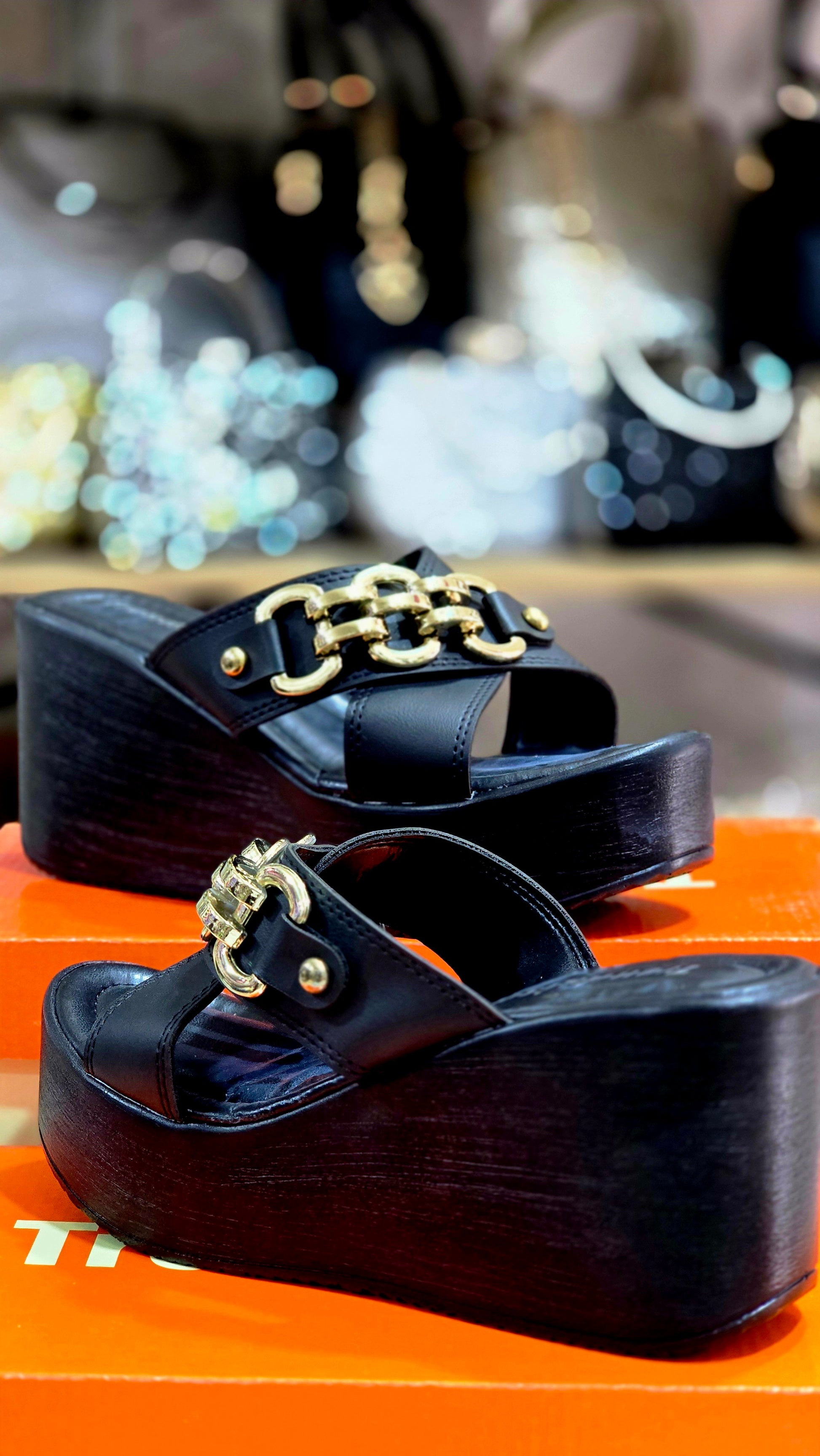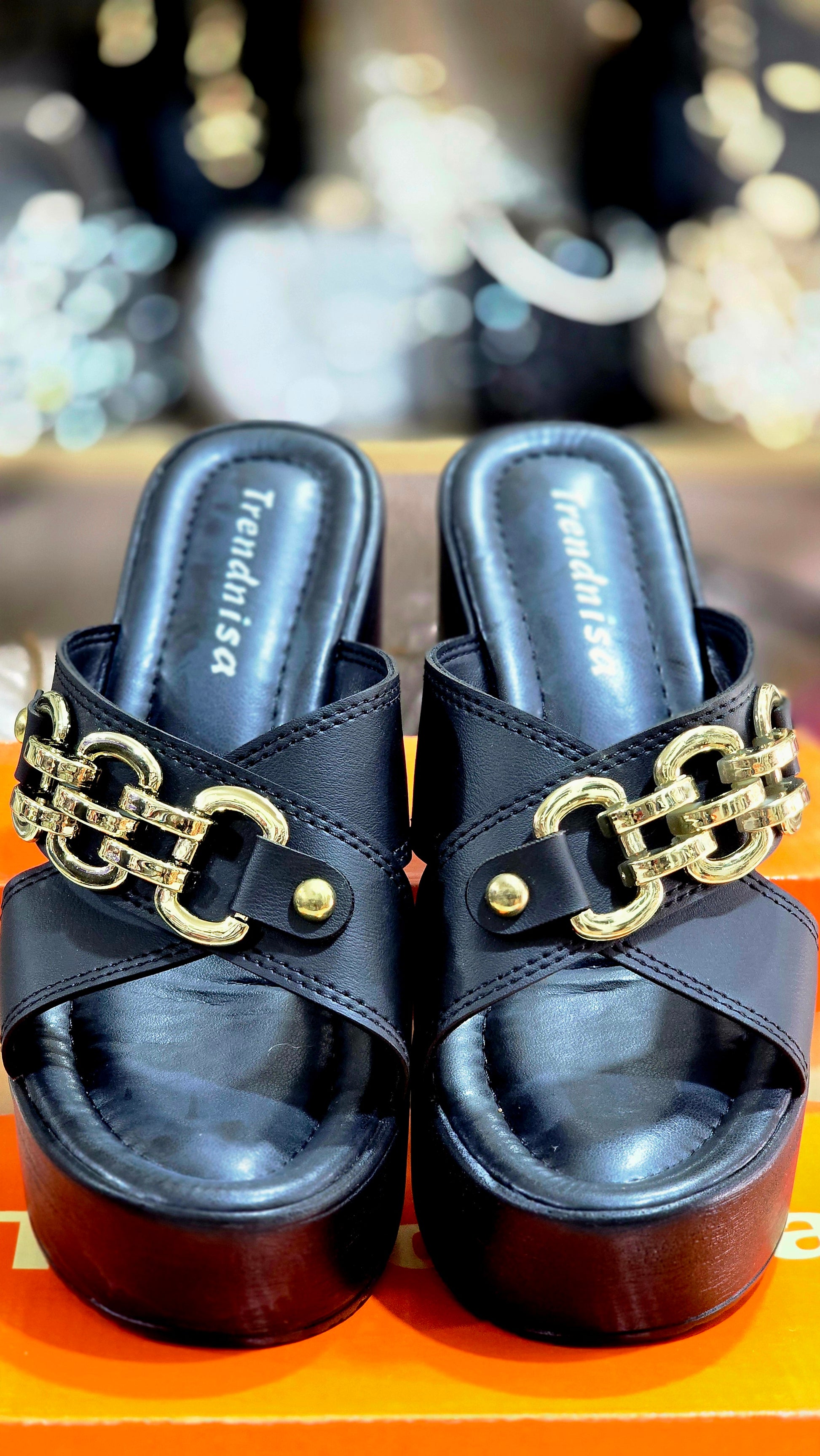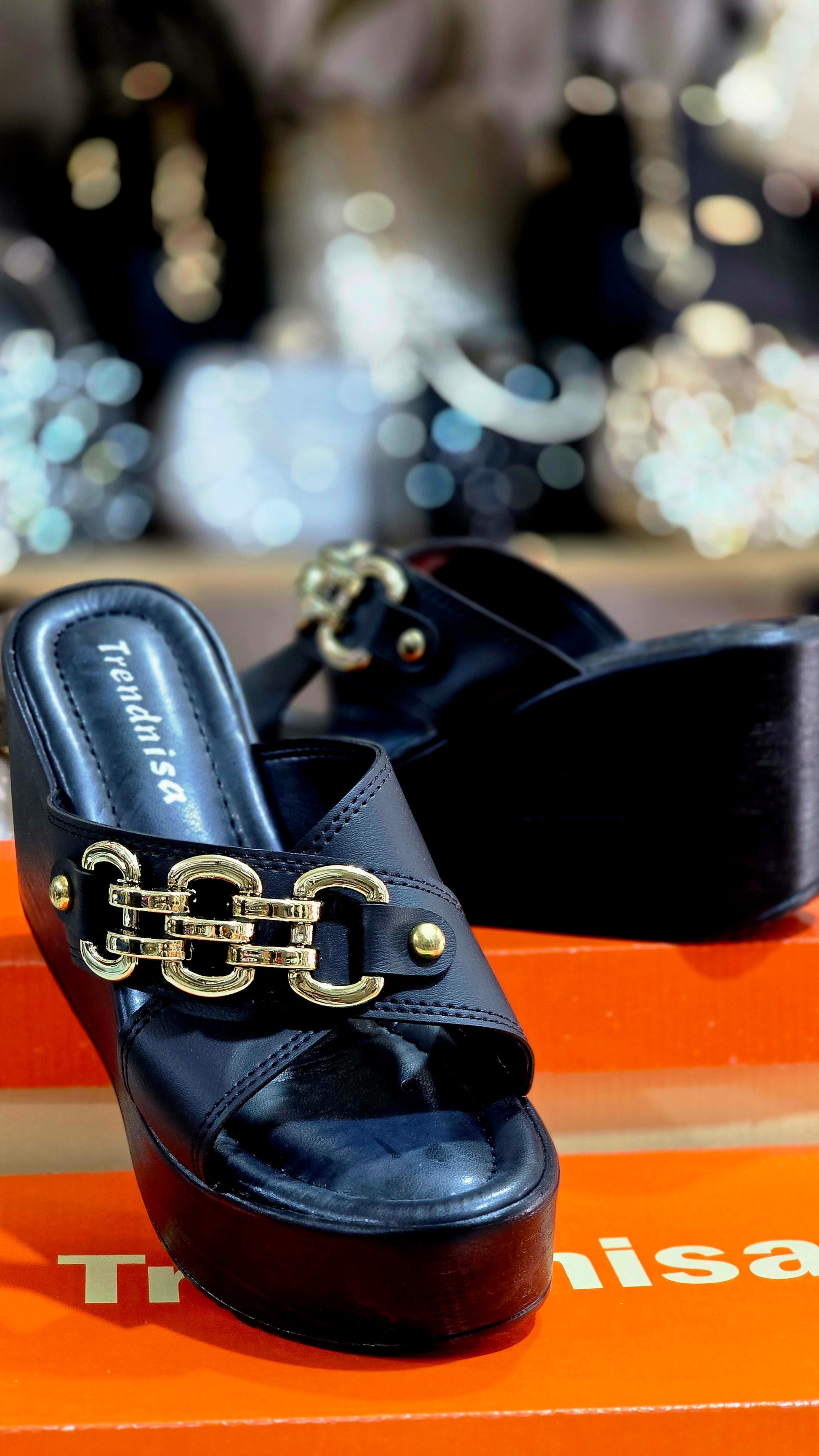 - Zarif siyah rengiyle her kıyafetle uyum sağlayan zincir tokalı çapraz bantlı kadın terlik.