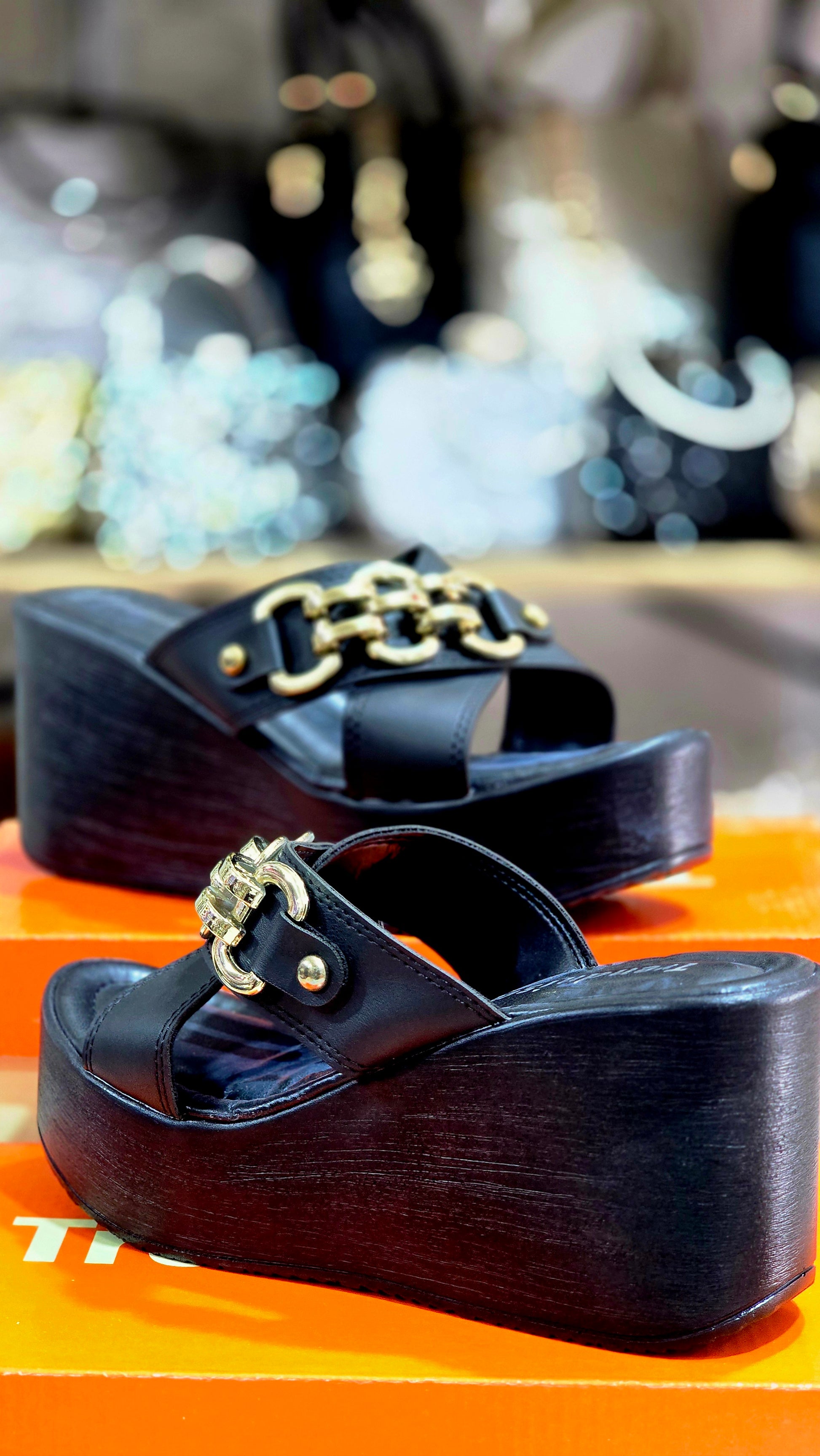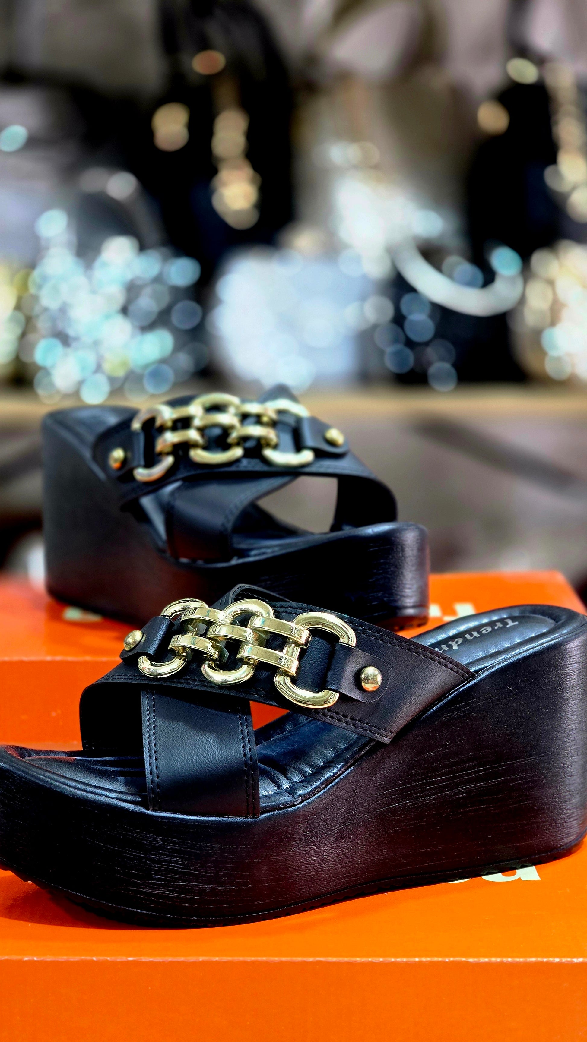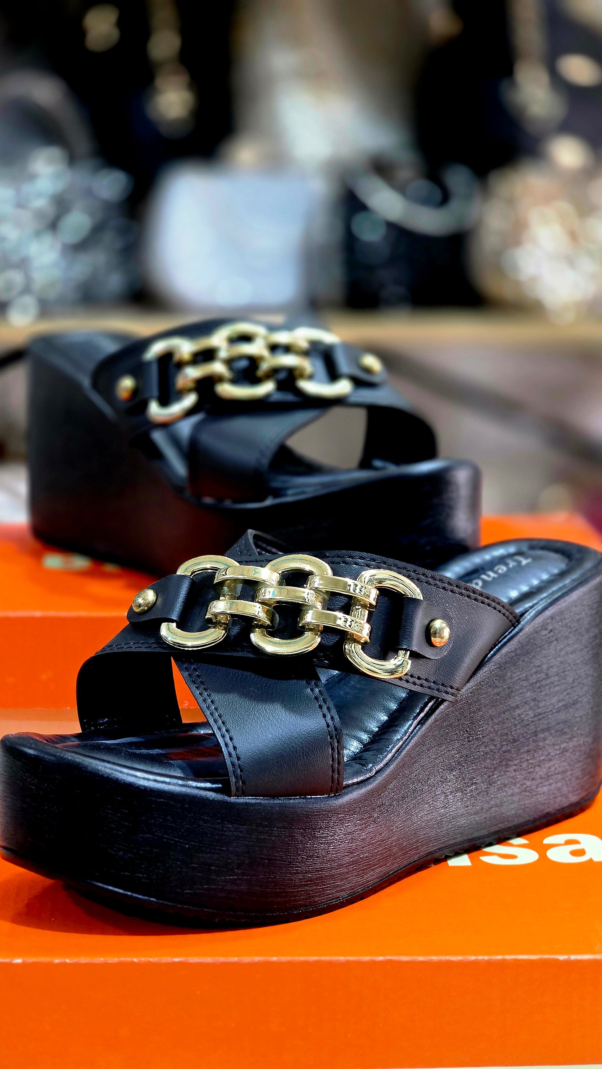 - Zarif siyah rengiyle her kıyafetle uyum sağlayan zincir tokalı çapraz bantlı kadın terlik.